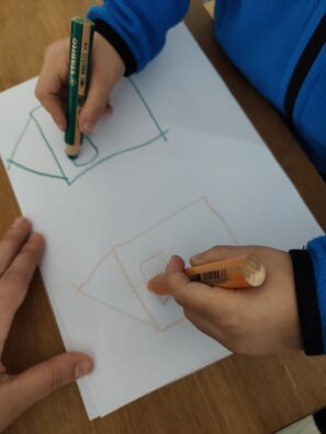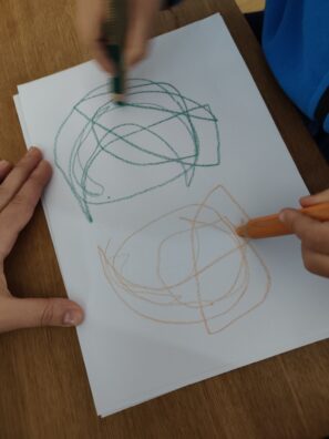 Zajímavou variantou je zrcadlové kreslení ve dvojici. Dva lidé sedí naproti sobě a kreslí společně – jeden začne jednoduchýtvar a druhý ho napodobuje jako v zrcadle. Mohou tak společně vytvářet obrázky, které vznikají díky spolupráci obou kreslířů. Tato varianta rozvíjí nejen motoriku, ale také vnímání druhého, spolupráci a radost ze společného tvoření. Stačí jen papír a dvě pastelky – a můžete začít objevovat, co všechno dokážou dvě ruce, když pracují spolu.