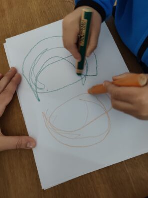 Bilaterální kreslení je jednoduchá, ale velmi účinná aktivita, při které kreslíme oběma rukama současně. Každá ruka drží tužku nebo pastelku a obě se pohybují zároveň – mohou vytvářet stejné tvary, zrcadlové obrazce nebo se volně pohybovat po papíře. Tato aktivita je přirozeně hravá a přitom velmi přínosná pro rozvoj dětí i dospělých.